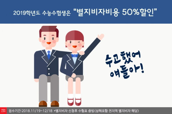 "2019학년 수능을 치룬 수험생들을 대상으로 별지비자 50% 할인"