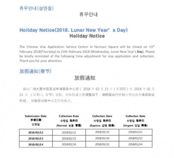 [종료] 2018 설연휴 별지비자, 개인&단체비자 휴무일 공지 안내