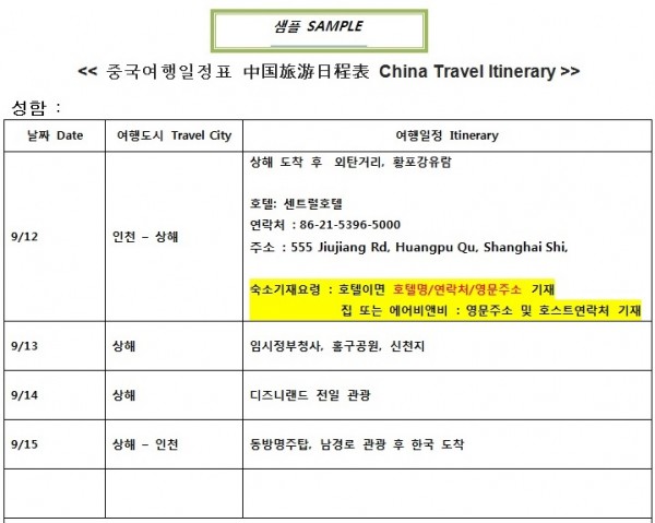 [다운로드] 개인&단체비자 "중국여행일정표" 양식